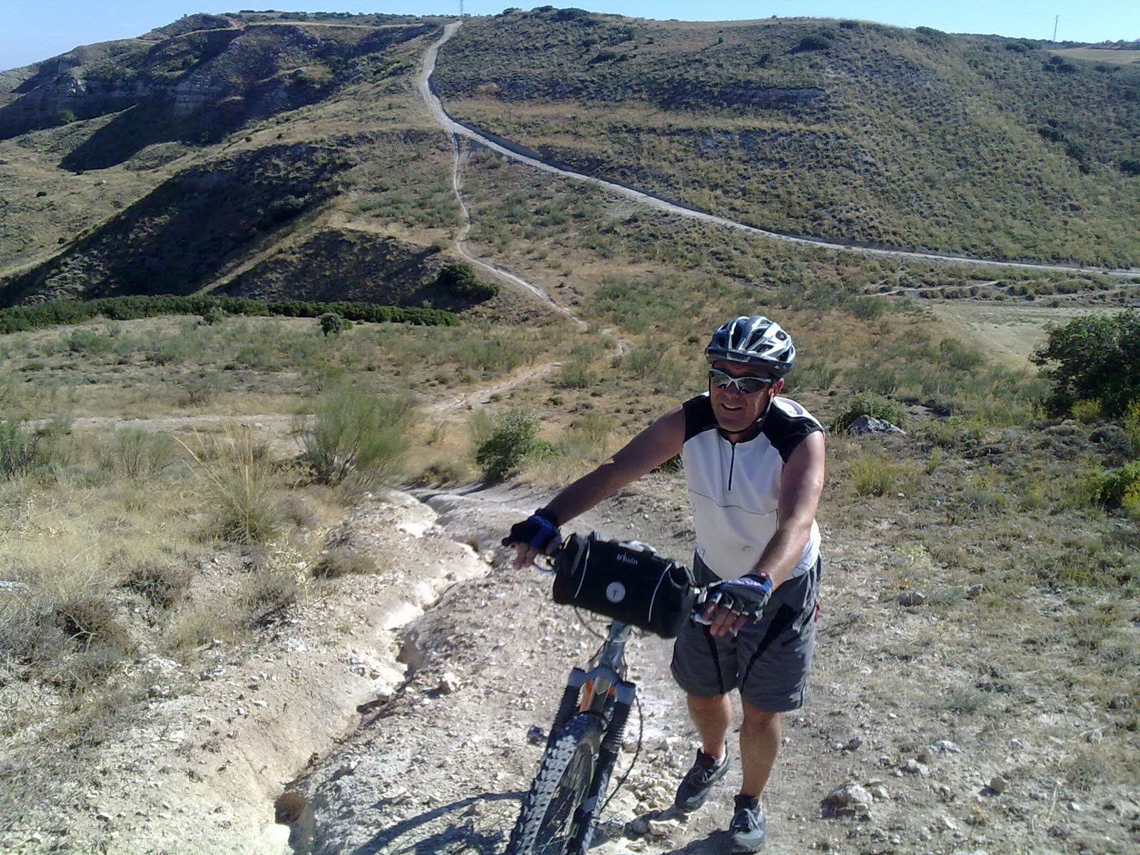 Estamos otra vez en la parte alta y rodamos por las rojas tierras de los Llanos del Espino. Comenzamos a bajar hacia el Ecce Homo por lo que parece más un cortafuegos que una pista. La subida a este cerro cada vez se parece más a la cuesta de la muerte de la Casa de Campo: siempre queda para mejor ocasión.